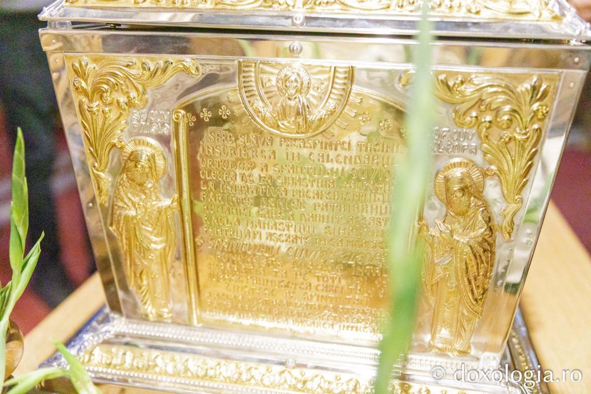 Moaștele Sfinților Cuvioși Pasie și Cleopa de la Sihăstria sunt așezate în două racle confecționate din argint, împodobite cu icoanele celor doi sfinți cuvioși români, precum și cu scene din viața și slujirea lor. Peste sfintele moaște sunt așezate două acoperăminte brodate cu icoanele Sfinților Cuvioși Paisie și Cleopa de la Sihăstria.